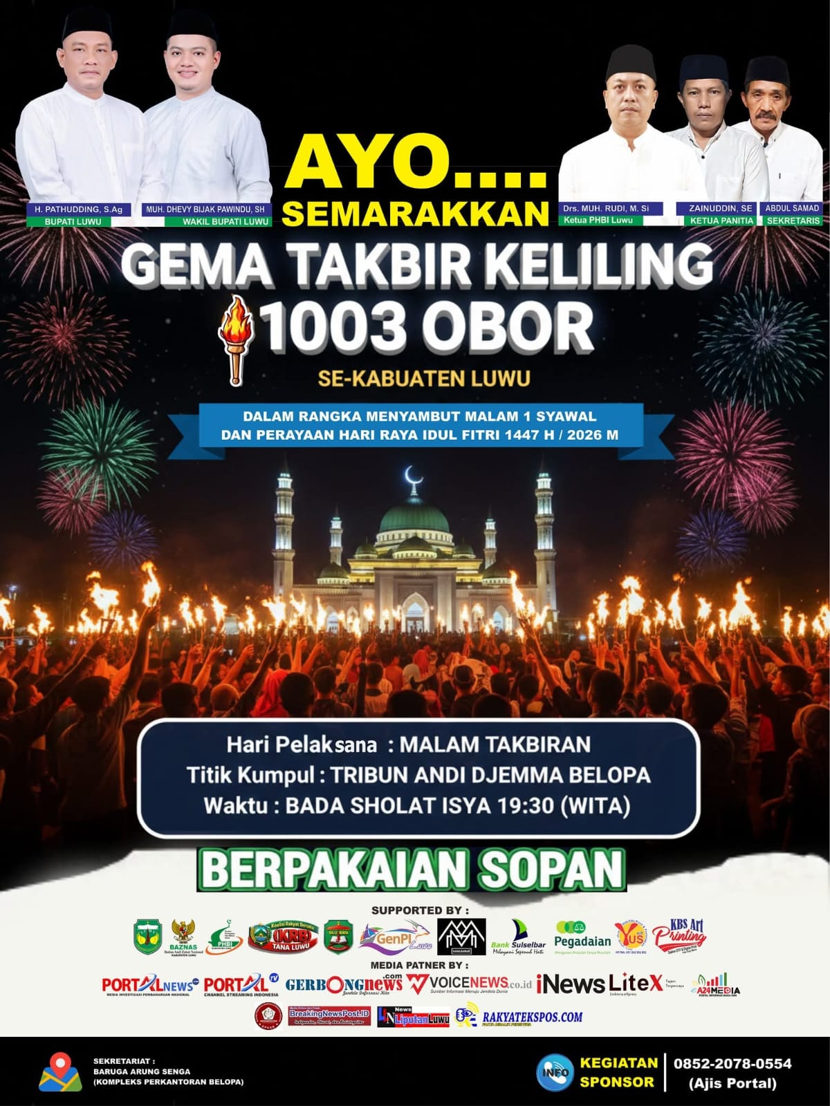 “Kegiatan Semarak Takbir Keliling 1003 Obor se-Kabupaten Luwu dirancang sebagai wadah Syiar Islam, pelestarian budaya yang religius, sekaligus memperkuat Ukhuwah Islamiyah antar masyarakat dari berbagai kecamatan di wilayah Kabupaten Luwu” Beber Ketua Koalisi Rakyat Bersatu (KRB) Tana Luwu.