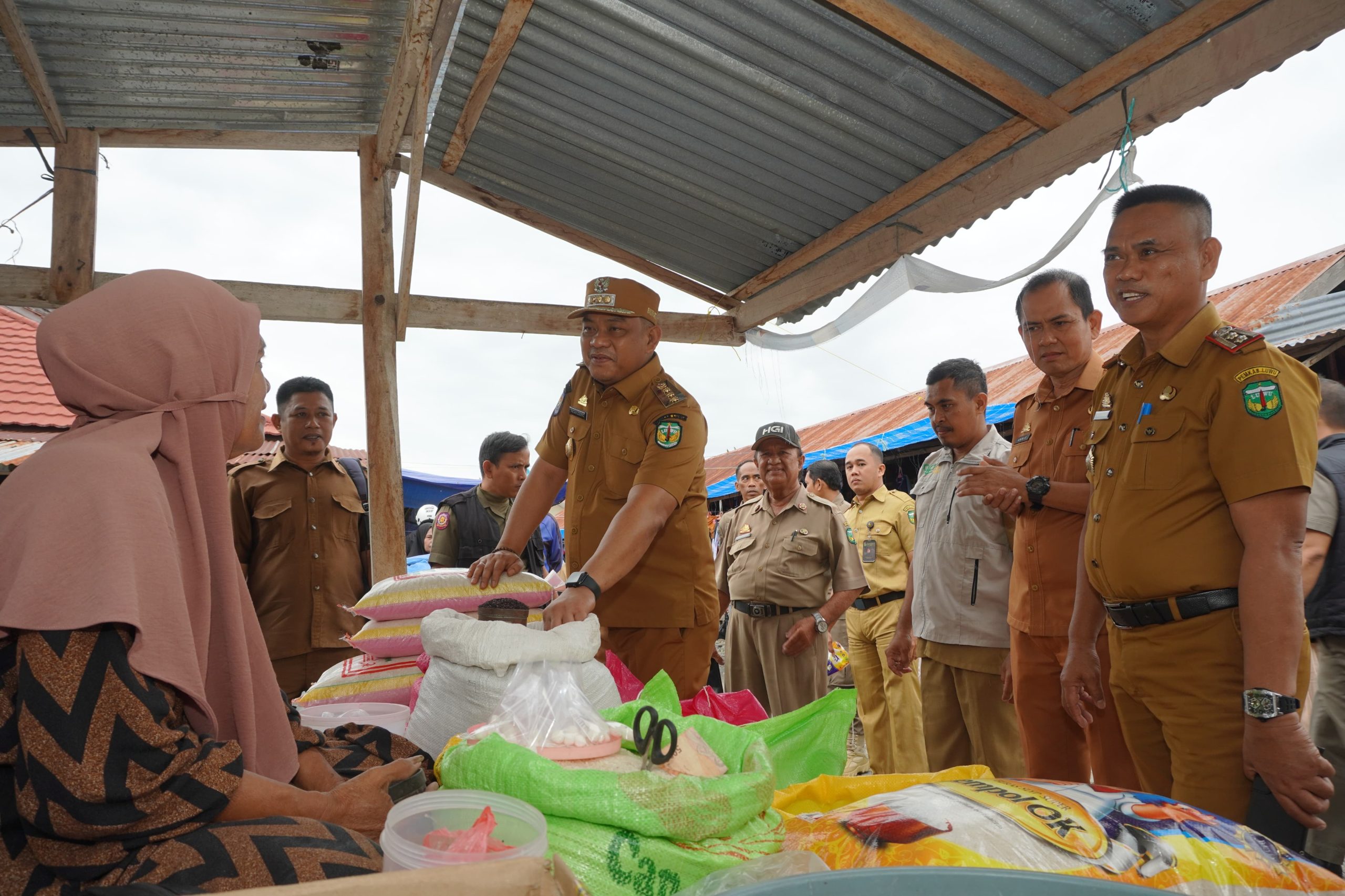 Setibanya di lokasi, Bupati meninjau sejumlah lapak pedagang yang menjual berbagai kebutuhan pokok, seperti beras, bawang merah, cabai, daging sapi, ayam potong, hingga telur.