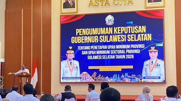 Makassar, Sulsel – Gubernur Sulawesi Selatan (Sulsel), Andi Sudirman Sulaiman menetapkan Upah Minimum Provinsi (UMP) Sulsel 2026. Surat Keputusan (SK) dibacakan langsung oleh Kabid Hubungan Industrial Dinas Tenaga Kerja dan Transmigrasi (Disnakertrans) Sulsel, Raodah.